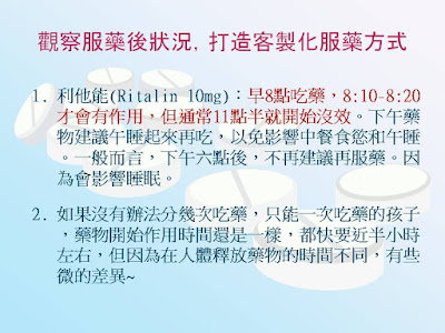 7.應該有客製化的服藥時間,合併藥物假期(Drug-holiday),需要想像力的課程通常不吃藥,課後補習或週六日補習,建議使用短時效的利他能Ritalin(10mg)。
