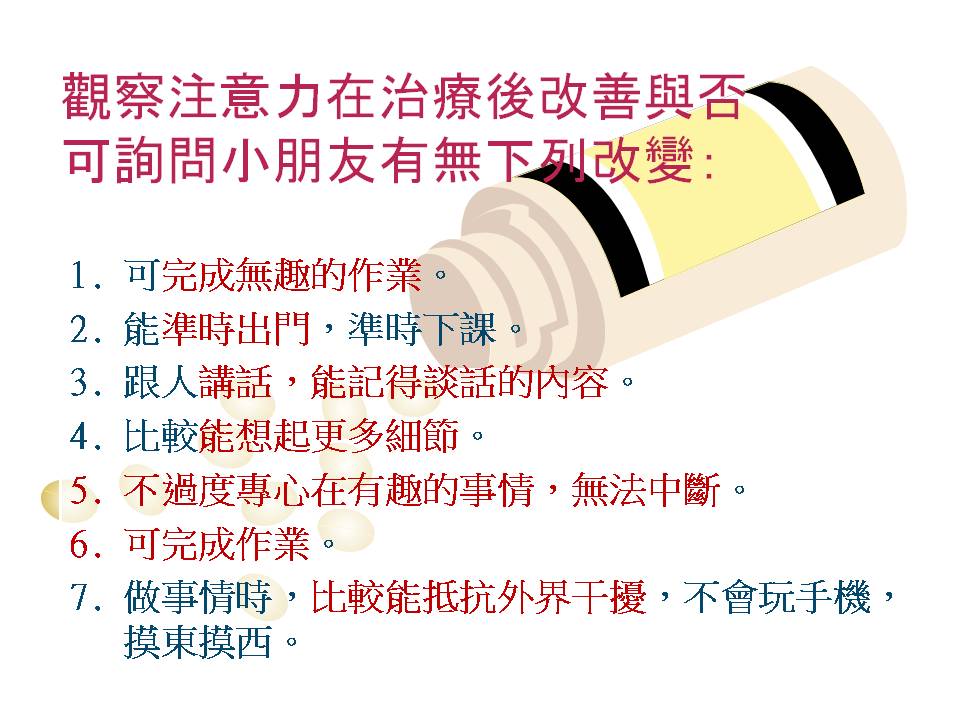 如果有這些條列中的變化,表示藥物對改善ADHD 症狀有正面的效果。