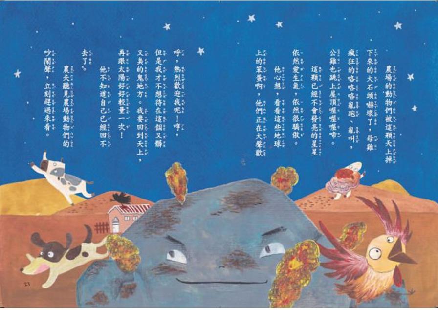 於是,壞脾氣的星星拚命生氣,他用盡所有的力氣生氣之後。果然,壞脾氣的星星燃燒成一顆大火球,然後咻──咚!滑過天際,直直的往地面墜落……