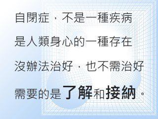 廣義的自閉症:無法適當表達自已的內心感受,無法適當處理自己的情緒...這些其實都是每個人從小到大都在學習的功課,其實這都是大腦功能的一部份。有些人具有容易與別人溝通及同理心的能力,所以適合當心理諮商師,有些人天生舞蹈或藝術感特好,這些我們都解讀為天賦,自閉症其實也是大腦溝通、理解別人的功能障礙,但是可以透過訓練、學習讓他更好,重點是他有沒有遇到願意幫助他的人,包括親人、友人、同學、老師..。就像天生沒有手的人,只要願意練習,可以用腳作所有手的事,但是他需要鼓勵,也需要旁邊的人..協助、等候他成長。各位好友,如果您的身邊有自閉症的人,恭喜您,上天是差派他來協助你,成為 更好的人! 因為他,你必須讓自己更有耐性...凡事更往積極面思考..你也更會看到自己,原來還有那麼多的不完美...所以你的包容性會更寬廣...