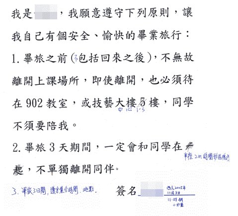 哥哥把不願意的部分用藍筆註解,也認為契約中第二點的文字內容有問題,他『得洗澡得上廁所』,『絕對』不可能『一定會和同學在一起』,所以他修改文字內容為『半徑2M的圓形區塊』。當然囉,哥哥修改的條約範圍合理的多了(笑!)