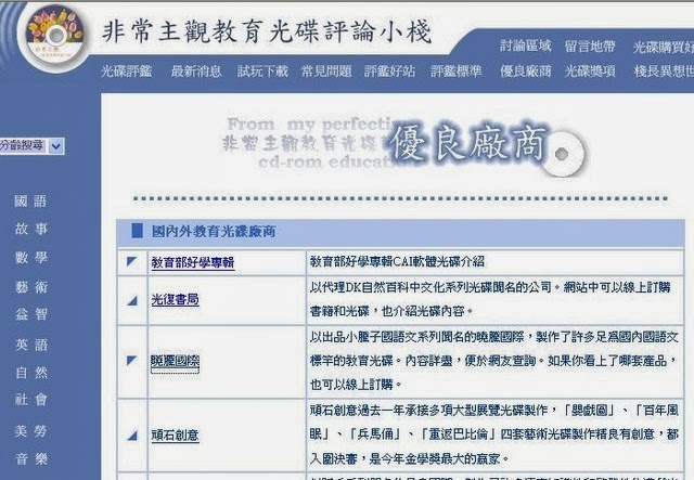 這7、8年來,因為光碟的魅力驚人,所以站長仍然一直不斷花錢付學費買經歷。早期滾石文化出了粉棒粉棒粉棒的光碟購買指南雜誌。光碟購買指南雜誌分成的幾個欄目中,「新片資訊」先介紹了國內外的新光碟,緊接著的「購買指南」則不但一片一片詳細介紹,還從內容、創意、介面設計、多媒體表現、手冊及安裝說明幾項評分。在「購買指南」欄中又分成教育類、知識類、藝術類、工具類、娛樂休閒類,顯然光碟種類繁多到全面包容了人們生活與工作的各種面向。