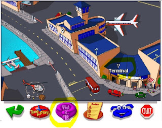 這次我先介紹 《Bazz的機場導遊 The airport》。這是個全英文的軟體。 buzzy的機場導遊引導者buzzy,帶領小朋友遊遍整個機場。我們可以從進入機場的遊戲通關開始從畫機位、通關到進入飛機內部,看看駕駛艙或客艙中觀察內部結構。