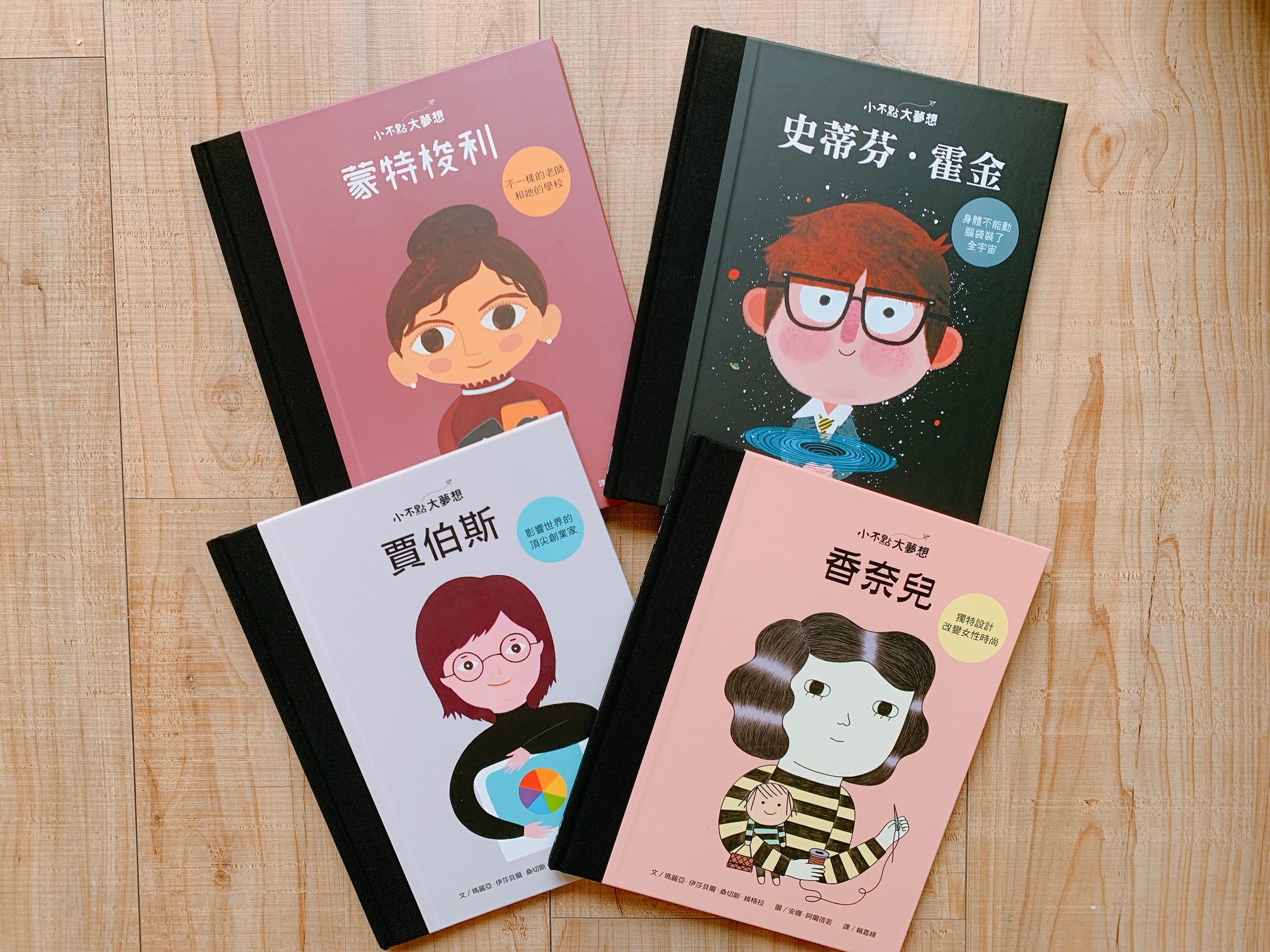 果不其然,打開第一頁就看到每位受傳者生平最大的特色。帶領我們進入霍金世界的是浩瀚的宇宙,帶我們一探蒙特梭利傳記的圖案是數字和文字,窺看香奈兒究竟的是黑白鄉間的條紋,引進賈伯斯門檻的是他對品質色彩的要求。