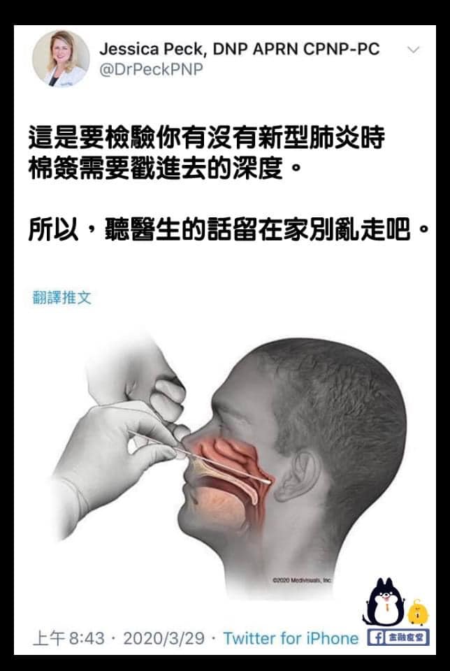 又有家長分享: 「我直接給兒子這張圖,觸覺敏感的他不讓他人碰觸口腔鼻,所以用這張圖嚇他,他就乖乖戴上口罩了~去年孩子的爸回國隔離時,有做這種檢查,身歷其境,說很痛不舒服,把小孩再次嚇一次,從此非常乖乖戴口罩。~」(請看下圖,圖檔取自網路)