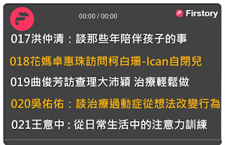 - 親職花路米12-16集podcast 吳佑佑醫師、洪仲清、王意中、曲俊芳、賴英宏、花媽卓惠珠主持 (共48集) https://bit.ly/33FO260