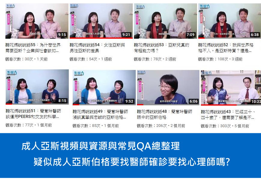 - 自閉亞斯的評估、治療、預後、幫助與介入(上下集) 簡意玲醫師、陳豐偉醫師、王意中心理師、花媽卓惠珠、曲智鑛特教老師