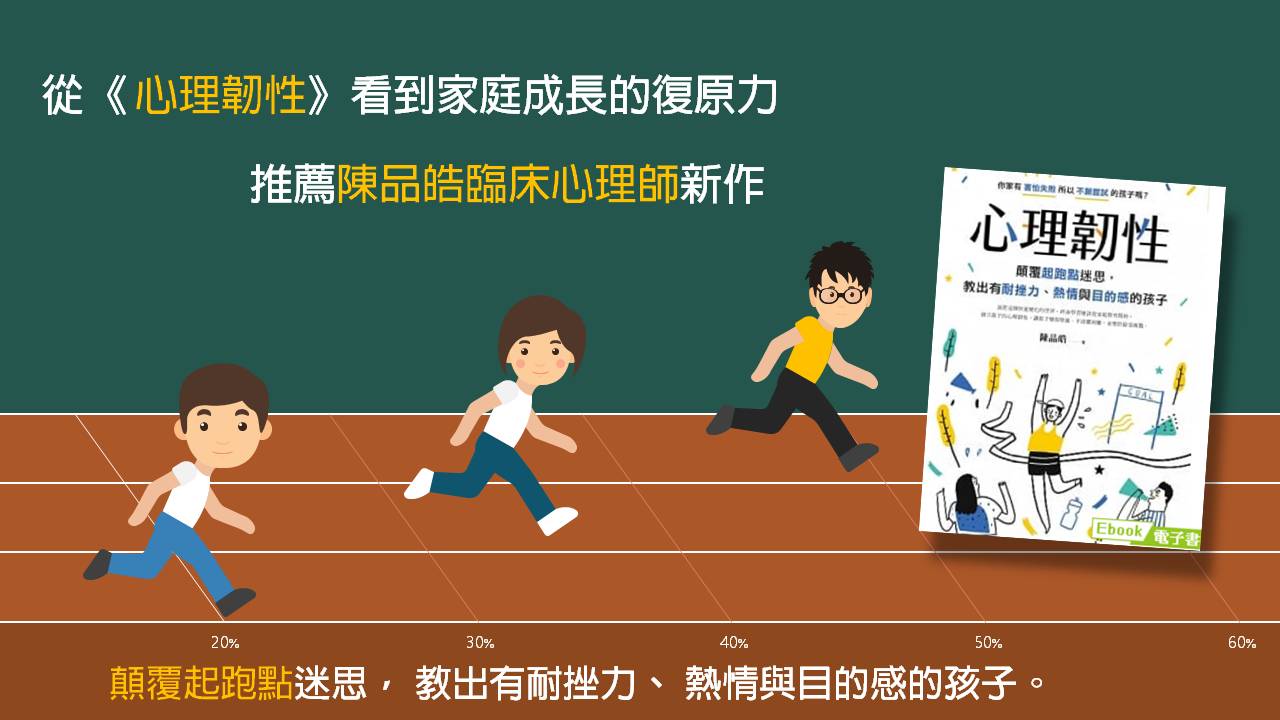 這本書 就如同書籍封面上面所寫的《 心理韌性》 是顛覆起跑點迷思, 教出有耐挫力、 熱情與目的感的孩子。