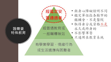 2020/09/24 曲俊芳資深特教老師談《特殊教育資源理解》(上) 曲俊芳老師 資源班 Q1.特殊教育是什麼? A1.對於普通教育。服務對象異同。生理或心理特質 -身障和資優。-具特殊需求者。實施地點多元。 -可融合可抽離。-普通學校到家庭。實施方式多樣。 Q2.特殊教育教師的工作是什麼? Q3.誰需要特殊教育? Q4.誰需要特殊教育 延伸閱讀 曲俊芳資深特教老師談《特殊教育資源理解》(上) 曲俊芳資深特教老師談《特殊教育資源理解》(下) 來源:https://helpasperger.blogspot.com/2020/09/blog-post_24.html 回上頁