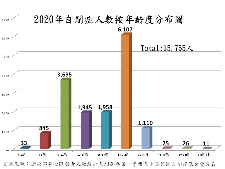 2020年第一季身心障礙總人數為1,186,325人。 自閉症人數15,755人佔身障人數1.3%,確診自閉症的人口年齡分布以學齡人口跟青年人口占了九成。青年部分可以說是10年前確診的孩子已經長大,社會急需看見這群人口的需求。