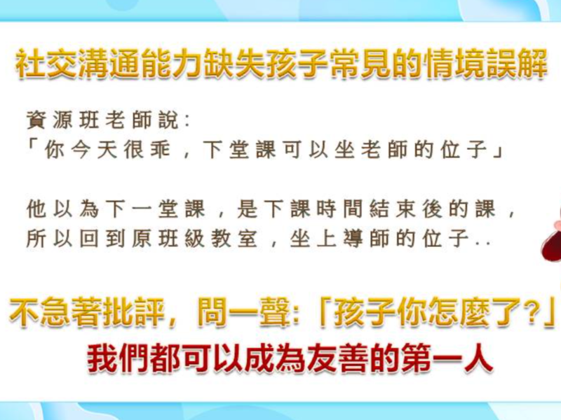 社交溝通能力缺失孩子常見的情境誤解-資源班老師說: 「你今天很乖,下堂課可以坐老師的位子」下堂課他去坐導師的位子